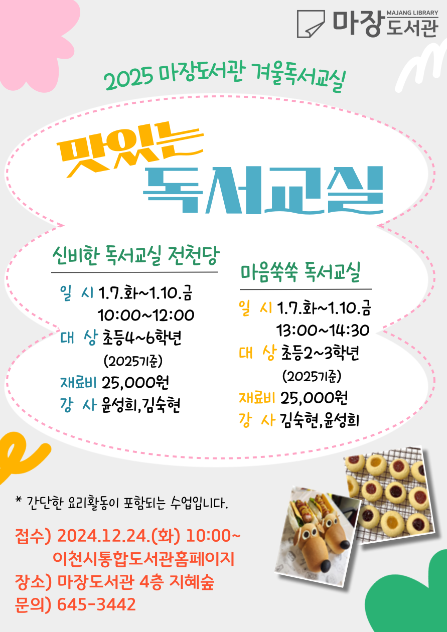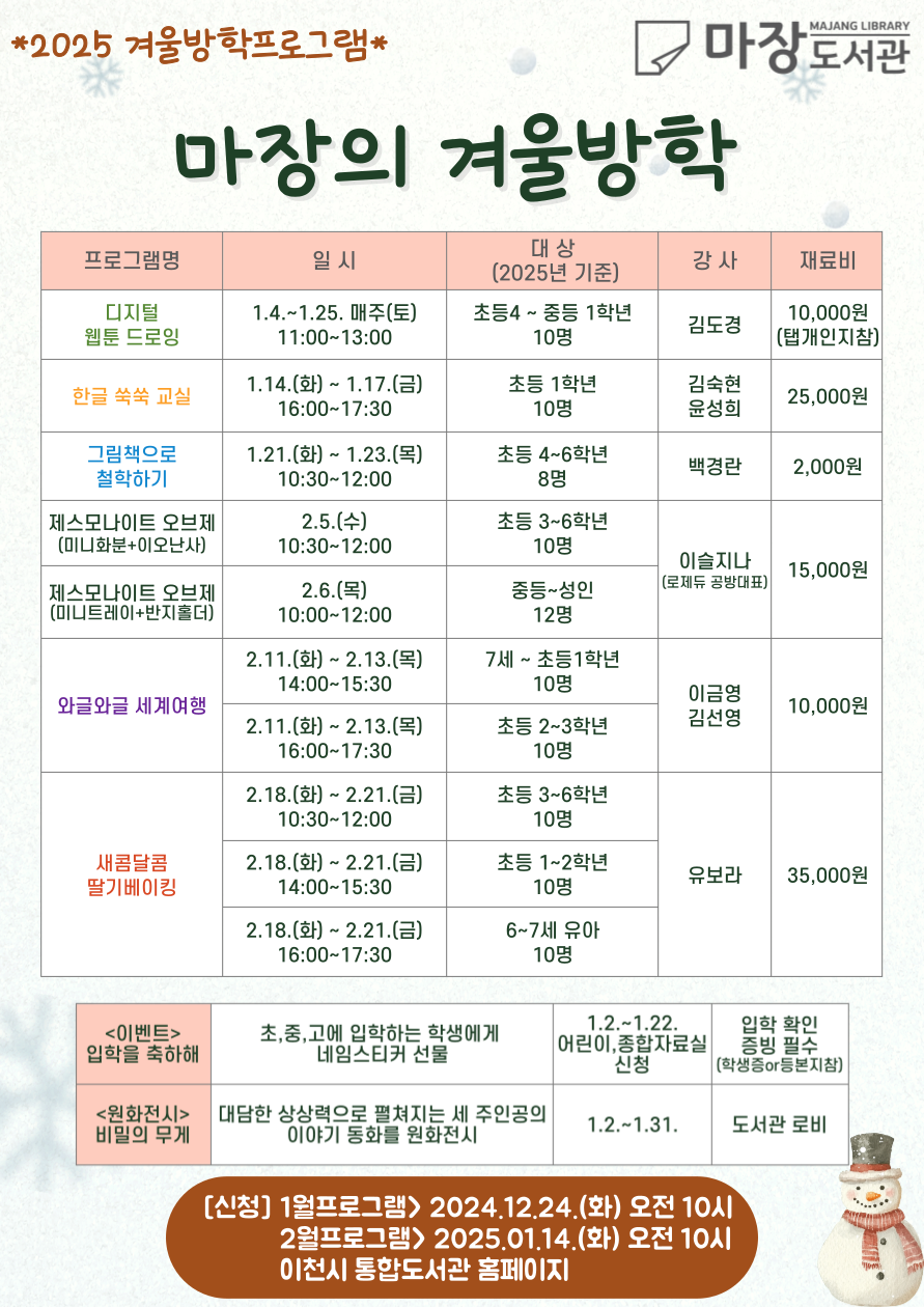 2025년 마장도서관 겨울방학프로그램, 겨울독서교실 안내 해 드립니다.