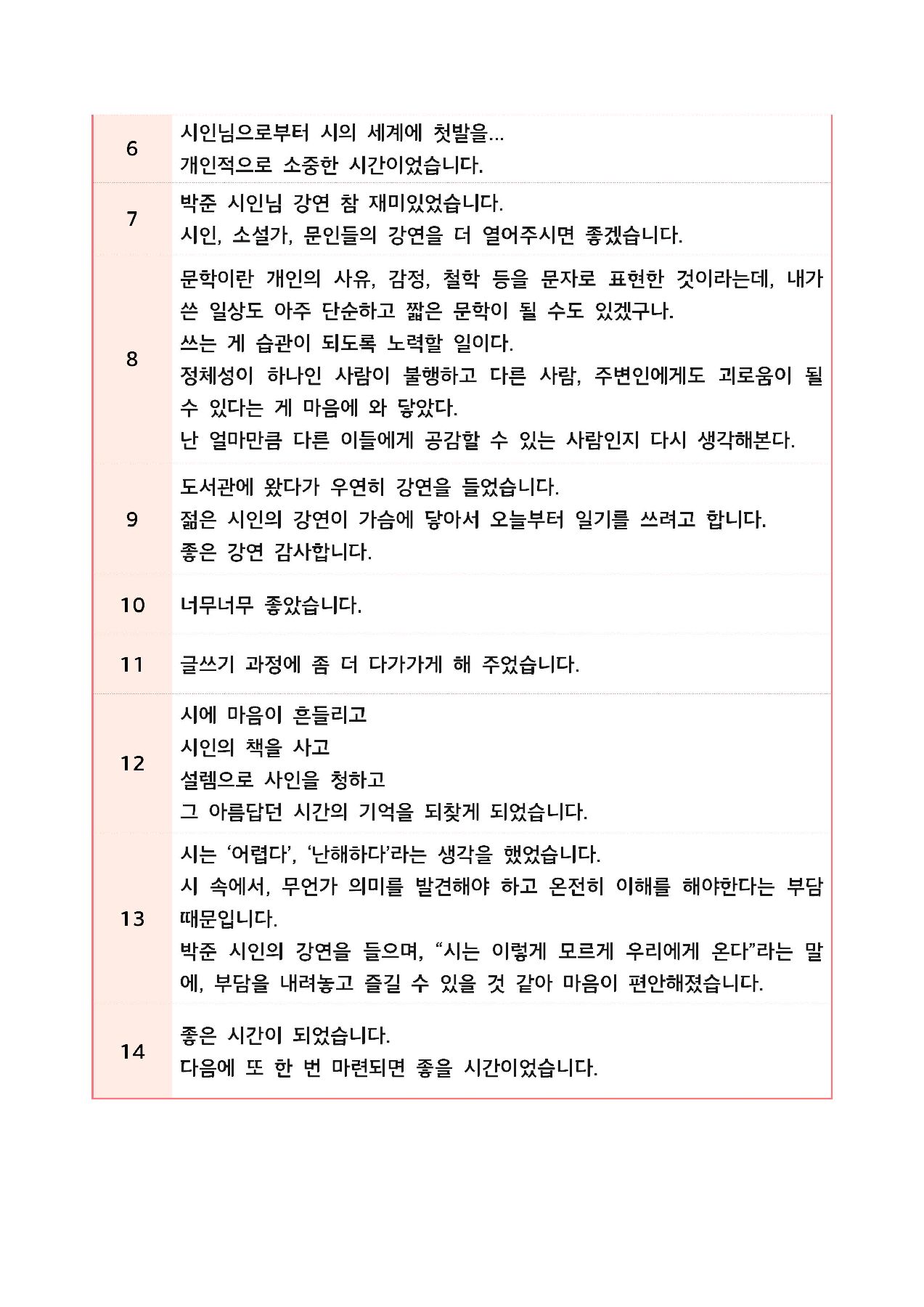 마장도서관 「당신에게 권하는 인문학」 박준 작가 강연 참여 후기 모음