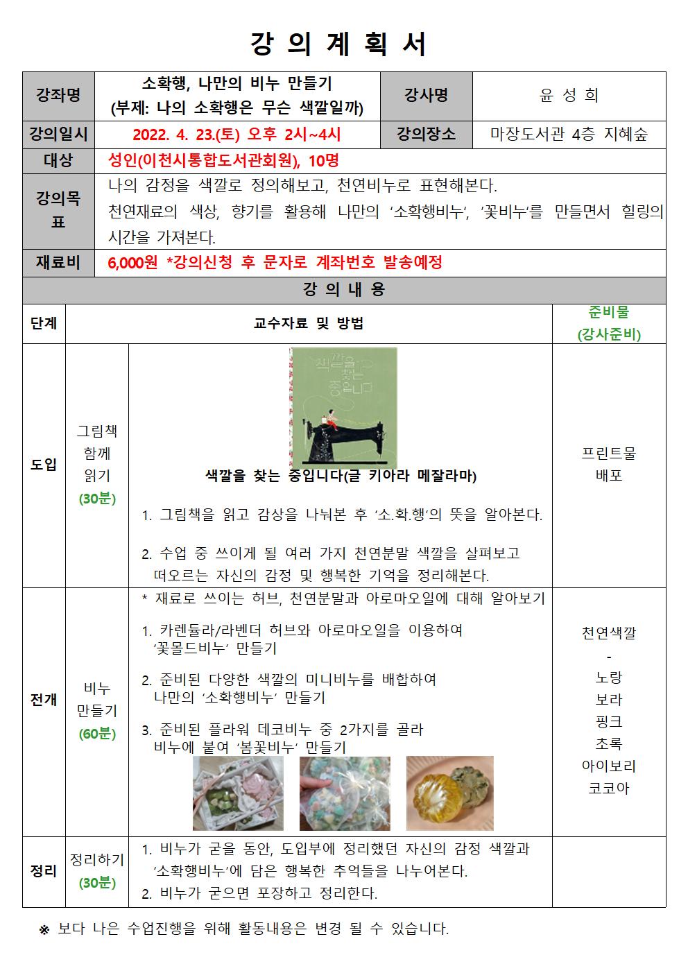 [도서관 주간 행사] 소확행, 나만의 비누 만들기(*나의 소확행은 무슨 색깔일까?)