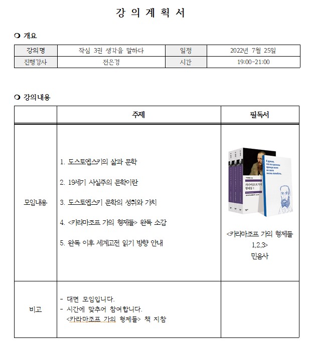 ● 운영내용: 카라마조프가의 형제들 완독 이후 세계고전 읽기 방향 안내 등