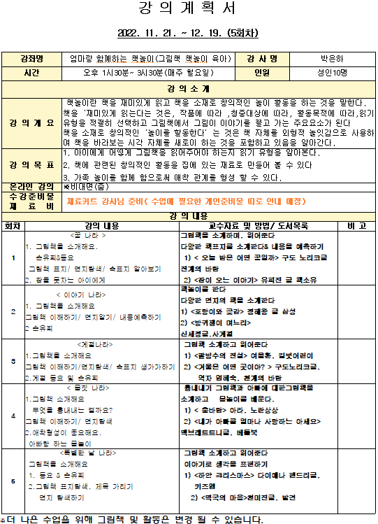 5. 수업사진은 도서관 홍보를 위해 사용될 수 있습니다. 프로그램 신청 시 이에 동의하는 것으로 간주합니다.