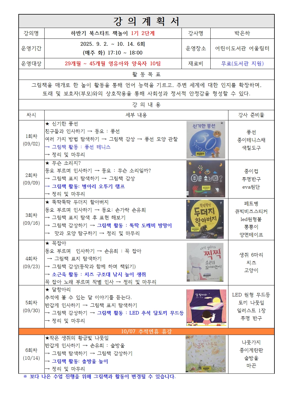 운영기간 : 9. 2. ~ 10. 14.(총 6회차) 매주 화요일, 오후 5시 10분 ~ 6시