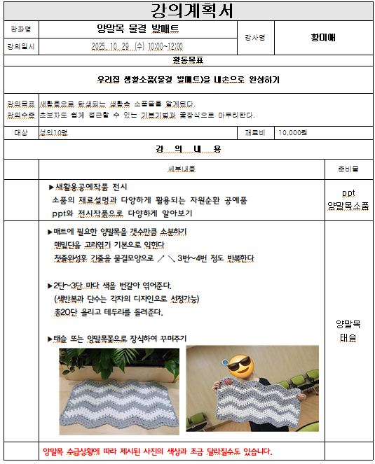 운영내용 : 양말목을 이용하여 우리집 생활소품(물결 발매트)를 내 손으로 만들어본다.