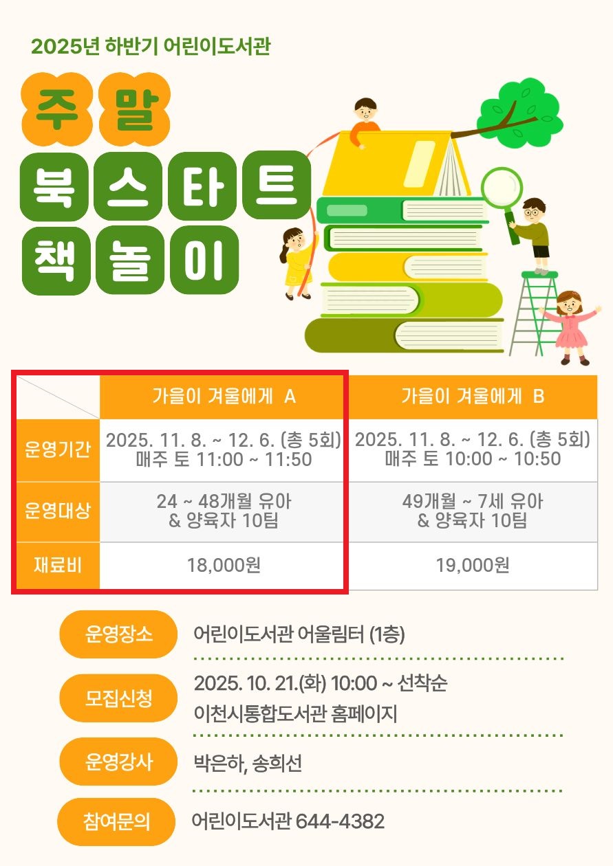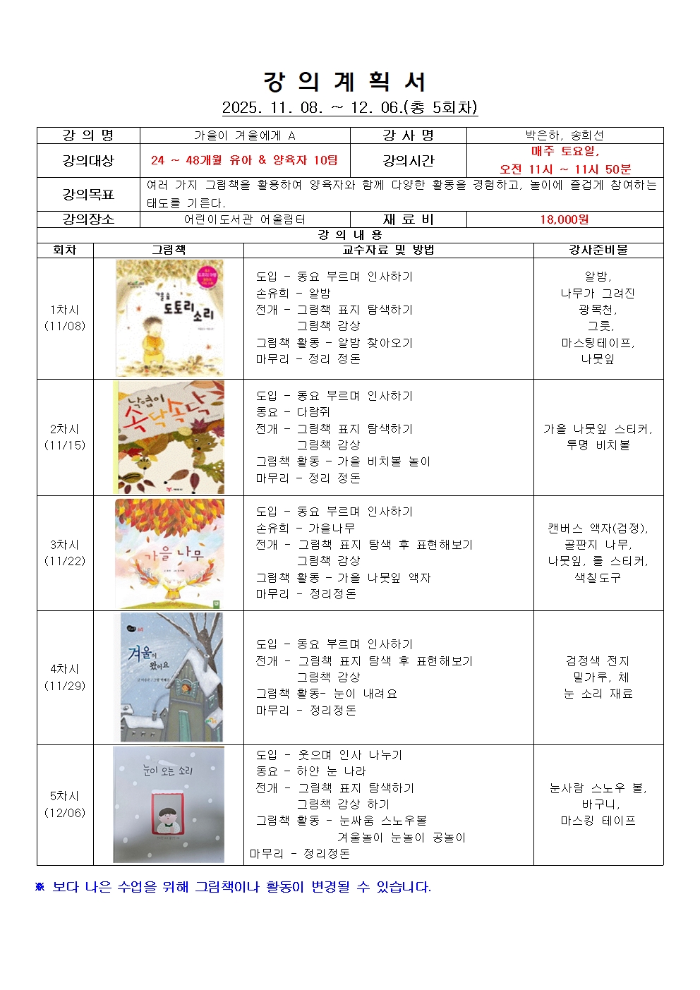 운영기간 : 11. 8. ~ 12. 6.(총 5회차) 매주 토요일, 오전 11시 ~ 11시 50분