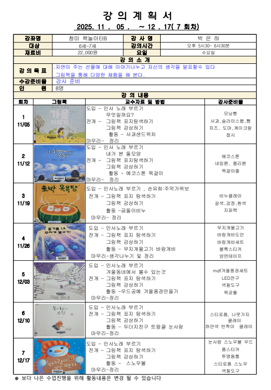 ◎운영기간 : 11.5.-12.17. (매주 수, 17:30-18:30, 총 7회)