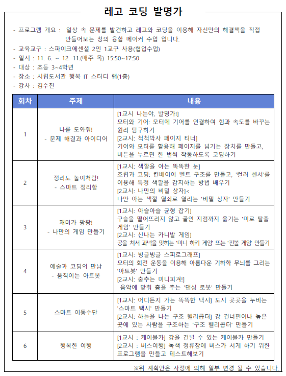 - 수업사진은 도서관 홍보를 위해 사용될 수 있습니다. 프로그램 신청시 이에 동의하는 것으로 간주합니다.