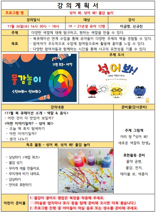[도서관과 함께, 이야기 나라로] 11월_섞어 봐, 섞어 봐! 물감 놀이