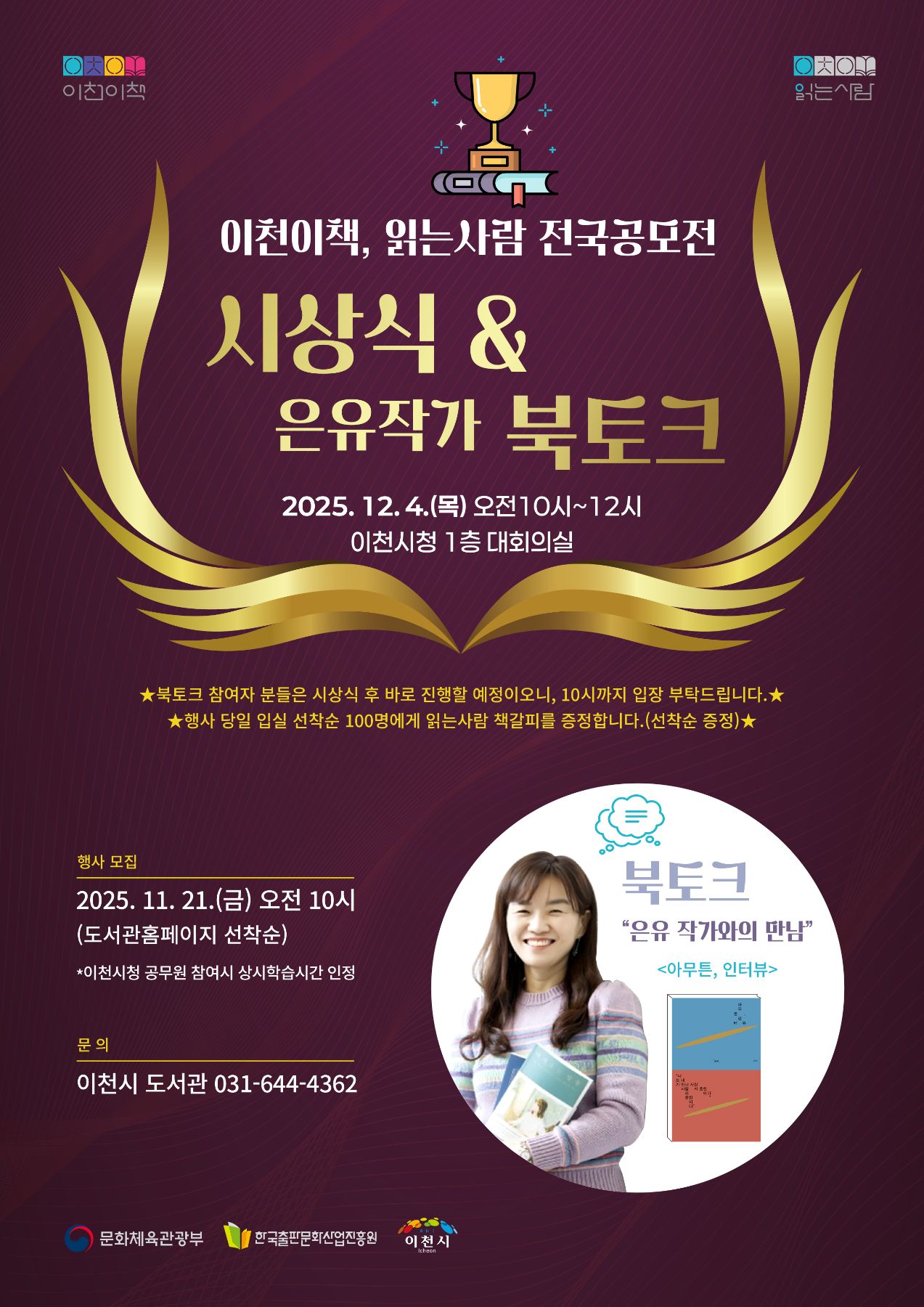 2025 읽는 사람 전국 공모전 시상식 및 북토크 신청 안내 전국공모전 수상자의 기쁨을 함께 나누고 은유작가의 삶과 글에 대한 깊은 이야기를 나누며 시민과 한 해의 독서 여정을 따뜻하게 돌아보는 자리를 마련하였습니다. 시상식 후 바로 북토르를 진행할 예정이오니 10시까지 입실 부탁드리며, 행사 당일 입실 선착순 100명에게 읽는 사람 책갈피를 증정합니다.(선착순 마감) 많은 관심과 참여 부탁드립니다,.^^