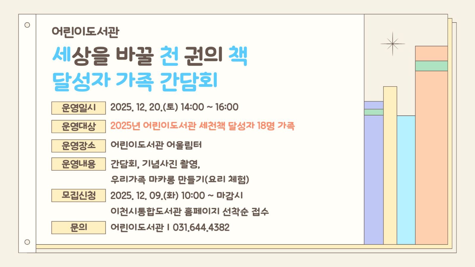 2025년 어린이도서관 세상을 바꿀 천 권의 책 달성자 가족 간담회를 진행합니다.