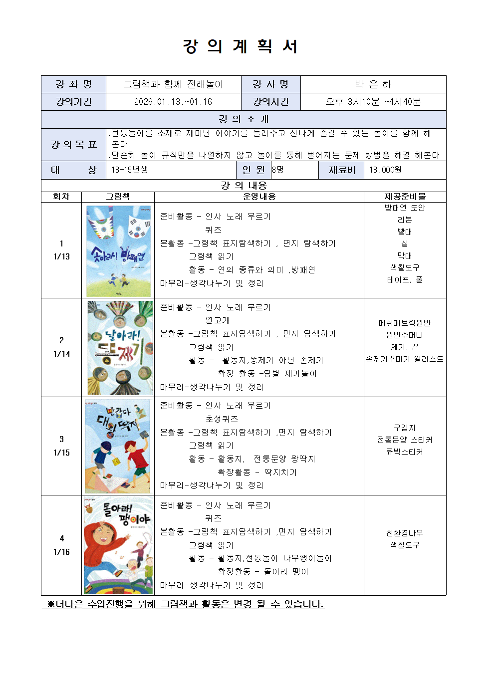 ✅일 시 | 2026. 1. 13.(화) ~ 1. 16.(금) 15:10 ~ 16:40