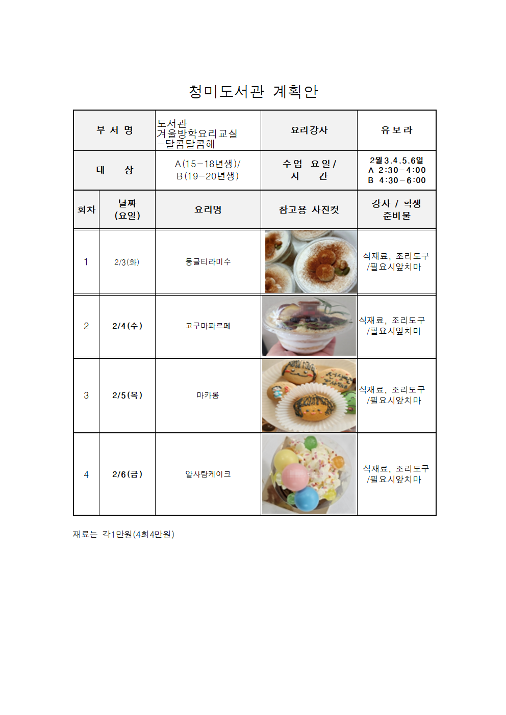 청미도서관 [겨울 속 따뜻한 도서관] 겨울방학 요리교실 -달콤달콤해A-