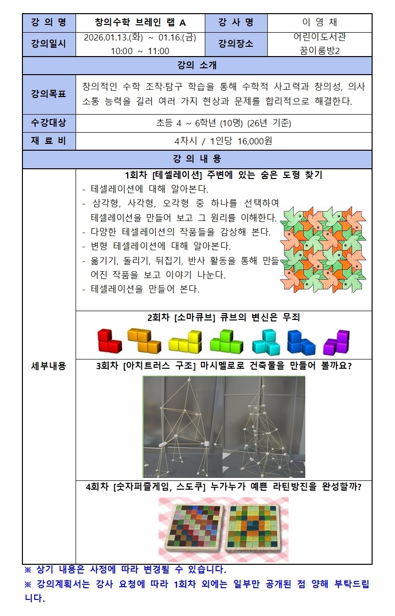 어린이도서관 [26년도 겨울방학 프로그램] 창의수학 브레인 랩 A