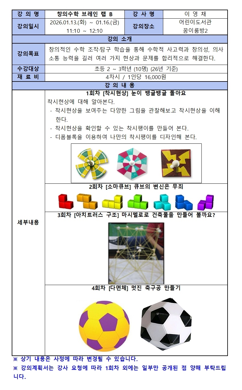 어린이도서관 [26년도 겨울방학 프로그램] 창의수학 브레인 랩 B