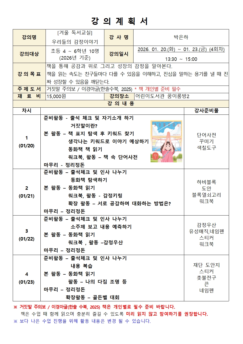 어린이도서관 [26년도 겨울방학 프로그램] 겨울 독서교실(우리들의 감정이야기)