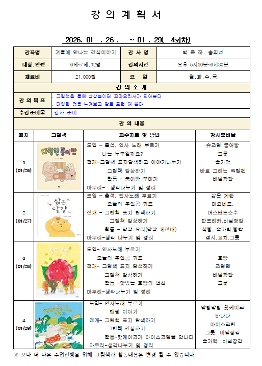 ● 일 시 : 2026년 1월 26일 ~ 1월 29일 (월~목) 오후 5시30분~6시20분 (총4회)