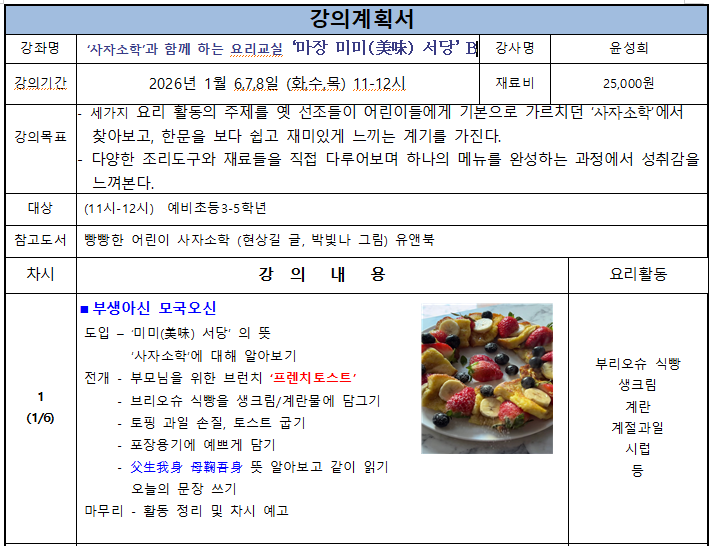 <겨울방학>마장 미미(美味) 서당 B(요리교실), 예비초등 3-5학년