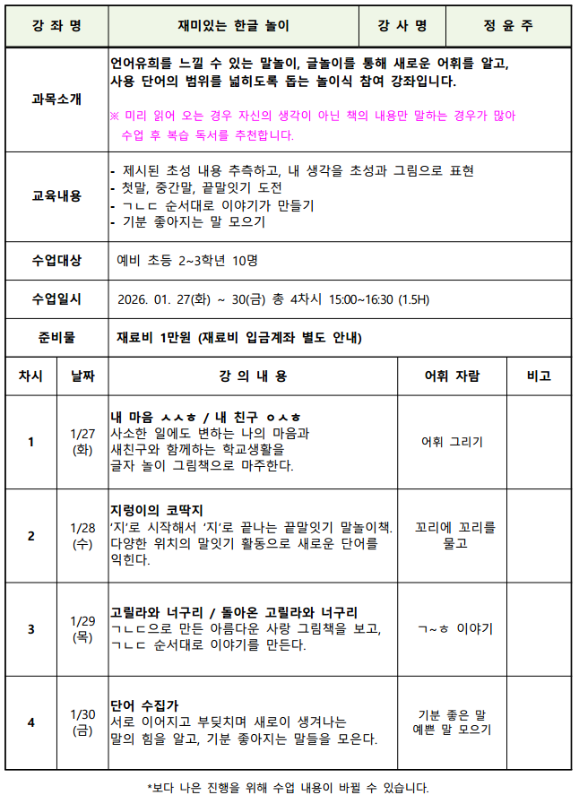 강좌기간 : 2026-01-27(화) ~ 2026-01-30(금)
