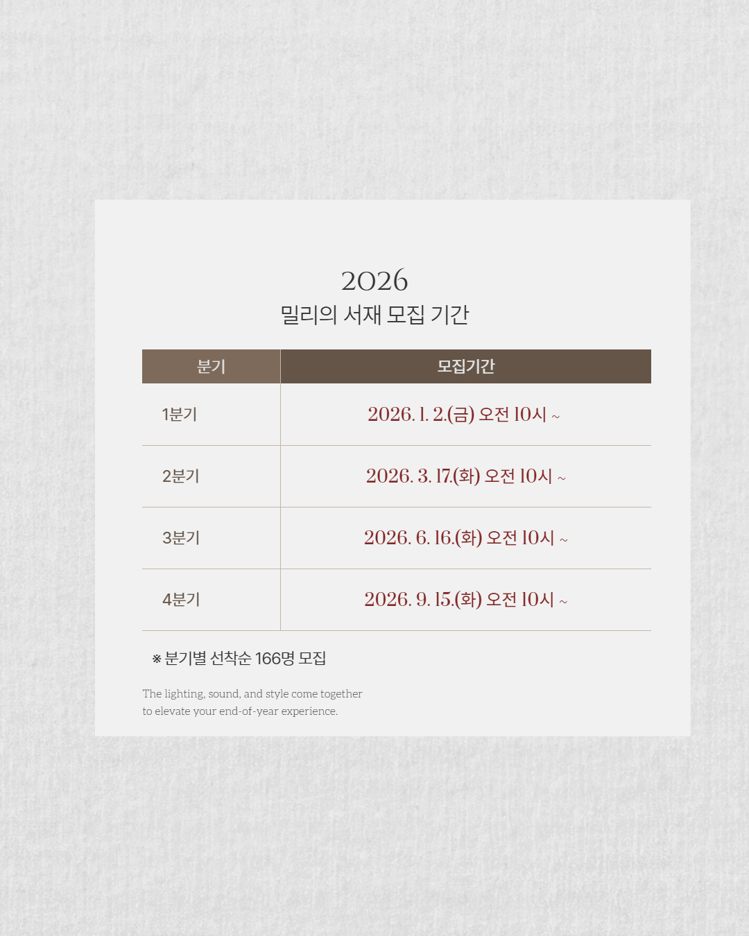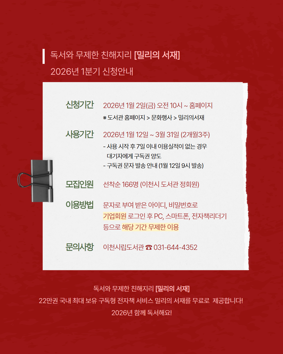 이천시 도서관 [밀리의 서재] 1분기 구독자 모집 >> 밀리의 서재 공지사항 자세히보기(클릭)