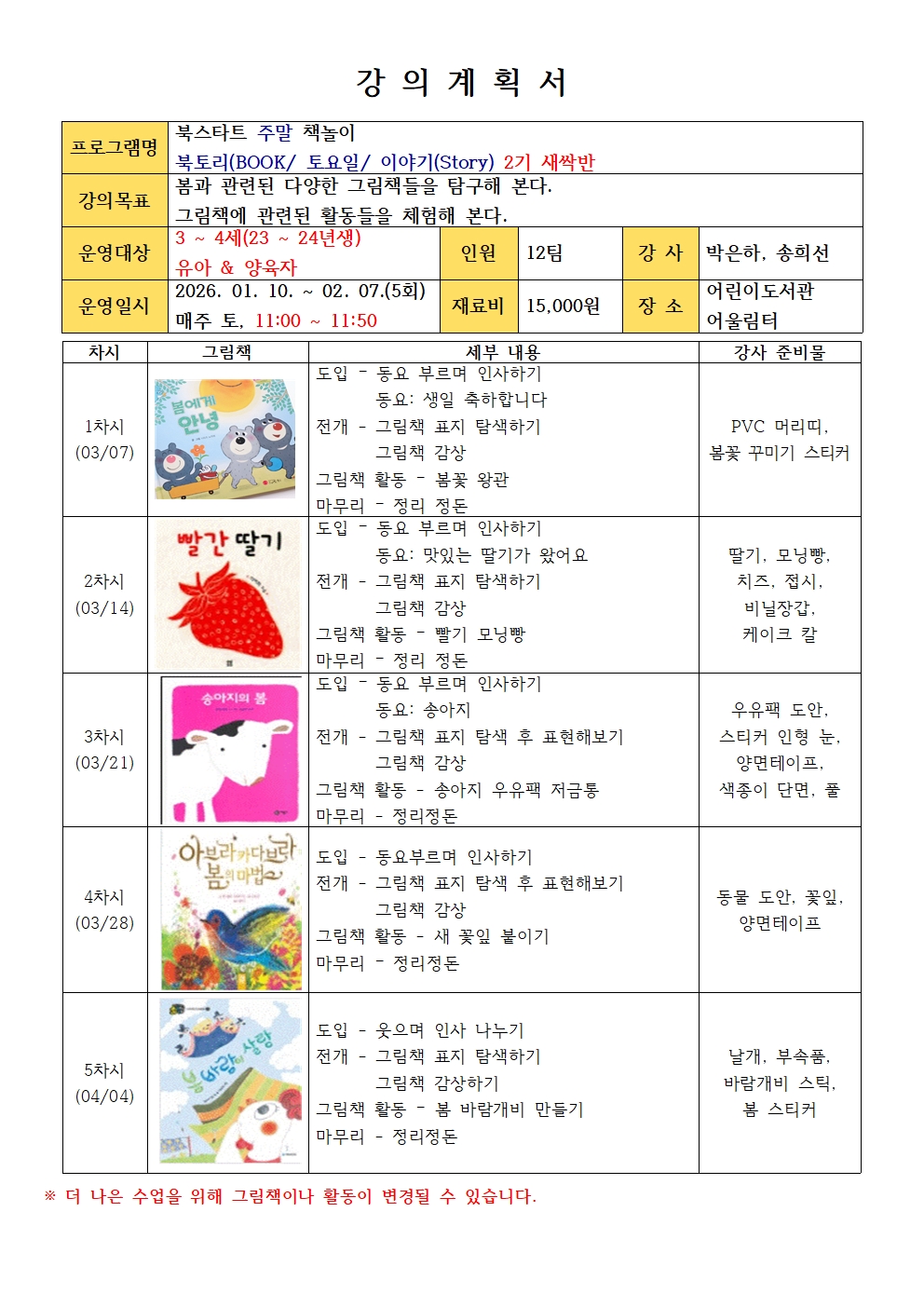운영기간 : 2026. 3. 7. ~ 4. 4.(총 5회차) 매주 토요일, 오전 11시 ~ 11시 50분