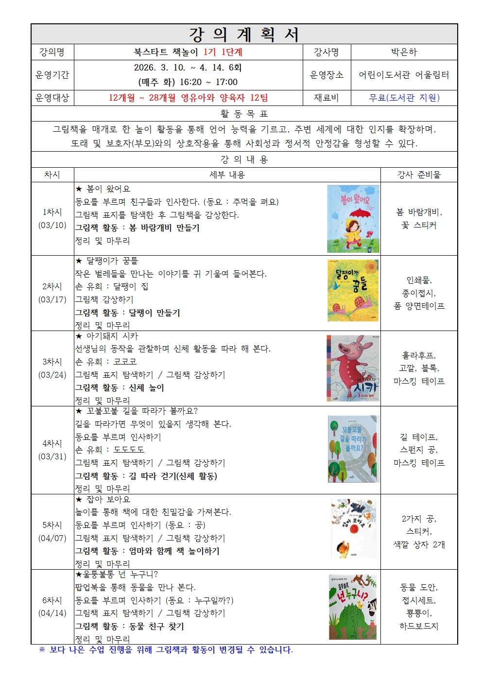 운영기간 : 3. 10. ~ 4. 14.(총 6회차) 매주 화요일, 오후 4시 20분 ~ 5시