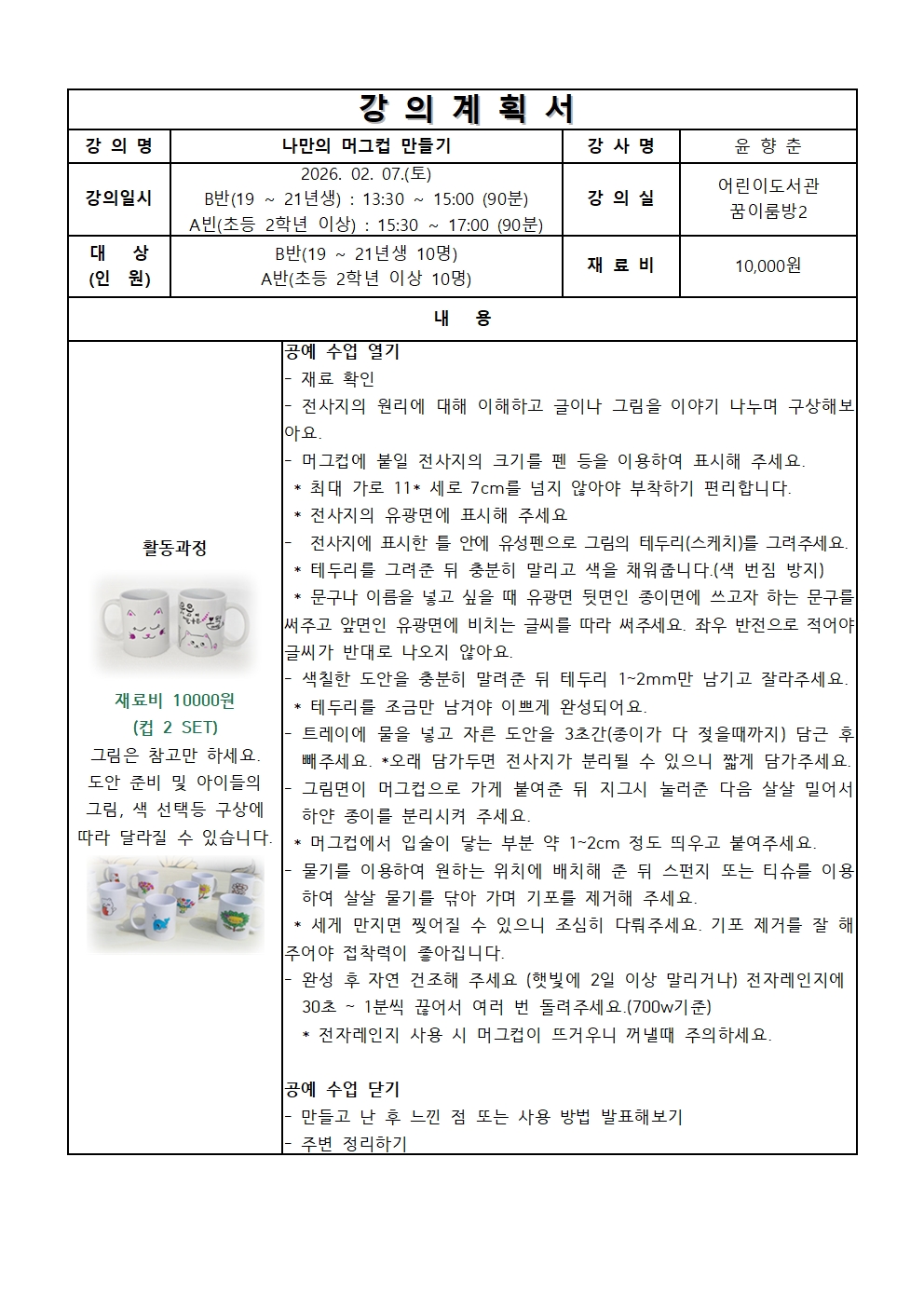 어린이도서관 [26년도 겨울방학 프로그램] 나만의 머그컵 만들기 A