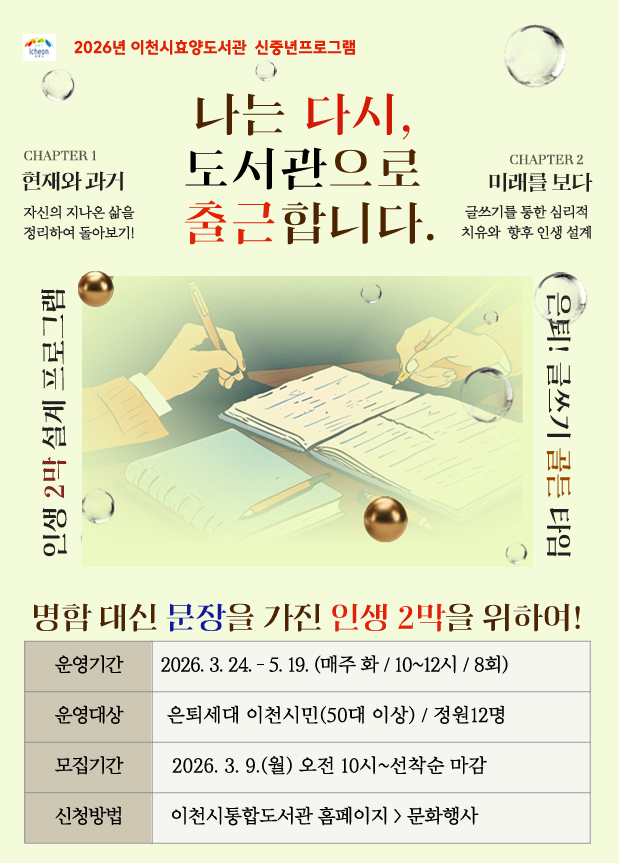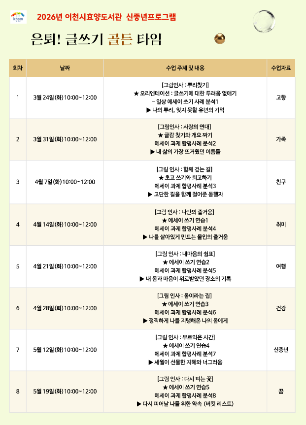 ● 운영기간: 26. 3. 24. ~ 5. 19. (매주 화요일, 10:00~12:00), 총8회