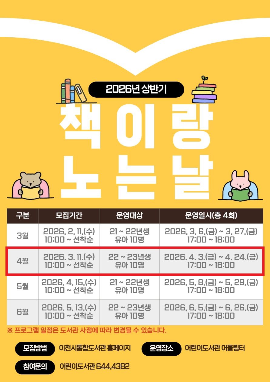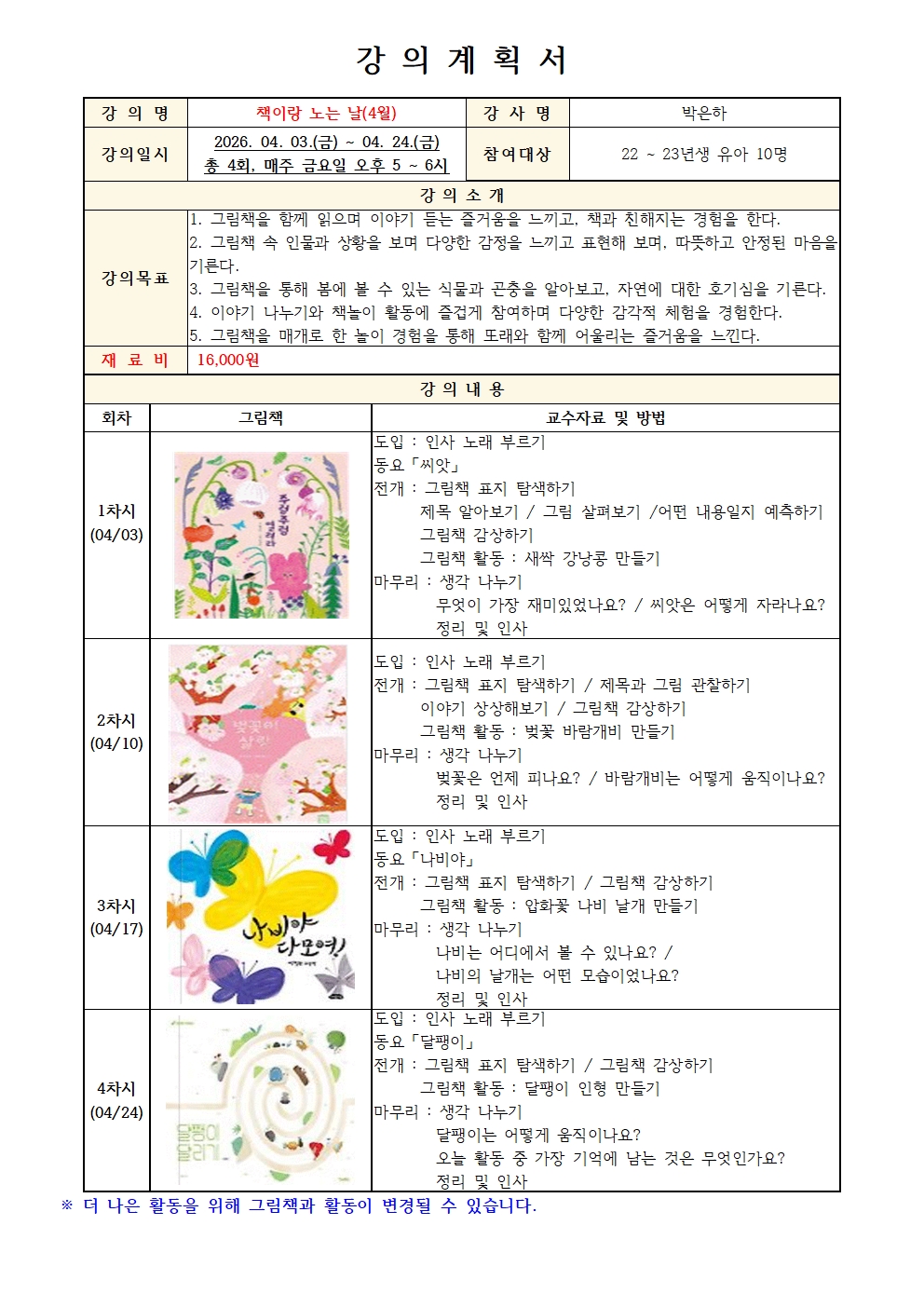 운영기간 : 2026. 4. 3. ~ 4. 24.(총 4회차) 매주 금요일, 오후 5시 ~ 6시