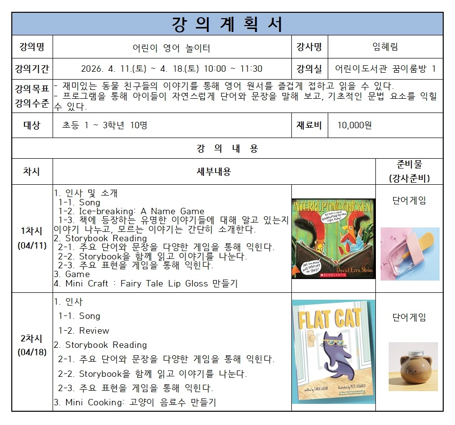 📌일시 > 2026. 04. 11.(토) ~ 04. 18.(토) 2차시 10:00 ~ 11:30
