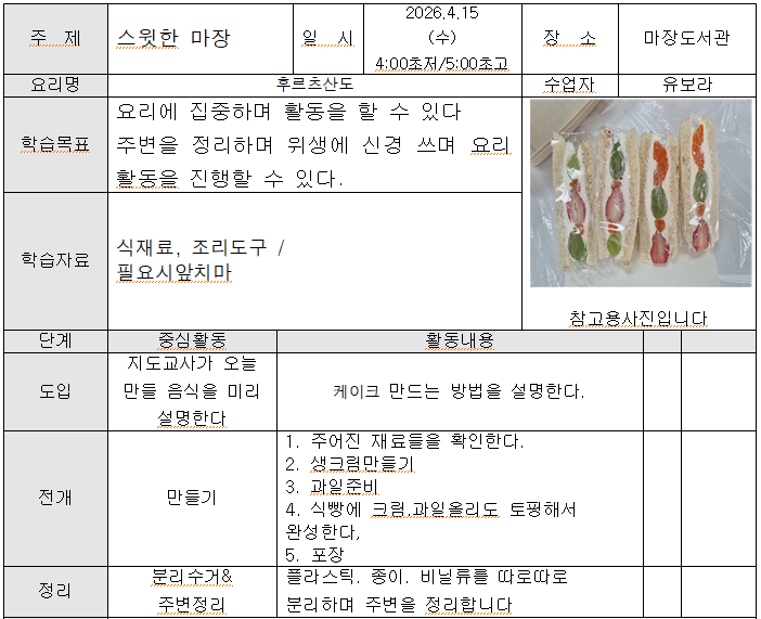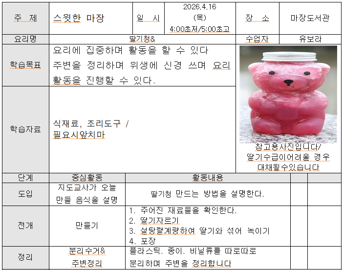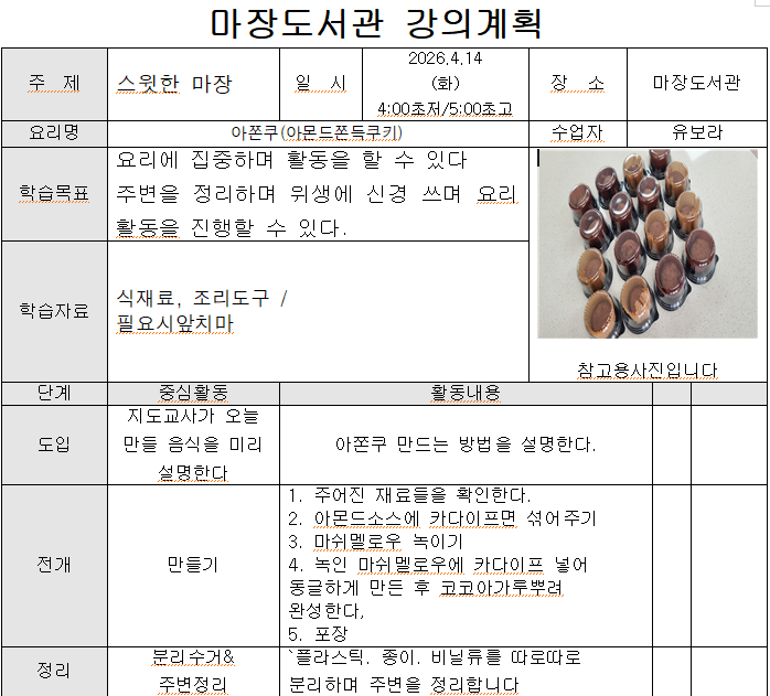 ♥아쫀쿠(아몬드쫀득쿠키), 후르츠산도, 딸기청을 만들어보는 요리교실 프로그램입니다.^^
