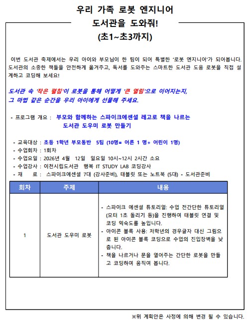 - 수업사진은 도서관 홍보를 위해 사용될 수 있습니다. 프로그램 신청시 이에 동의하는 것으로 간주합니다.