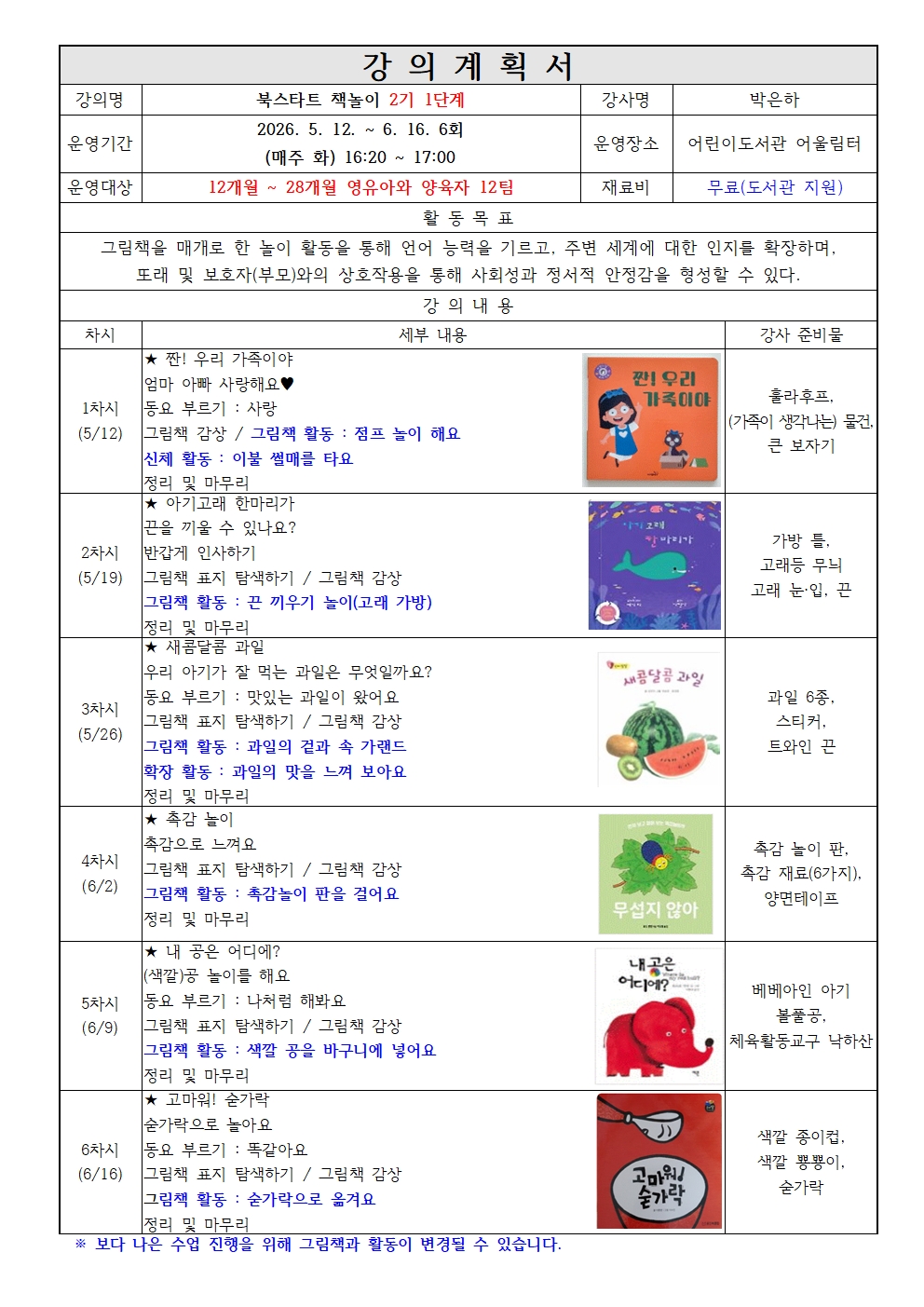 운영기간 : 5. 12. ~ 6. 16.(총 6회차) 매주 화요일, 오후 4시 20분 ~ 5시