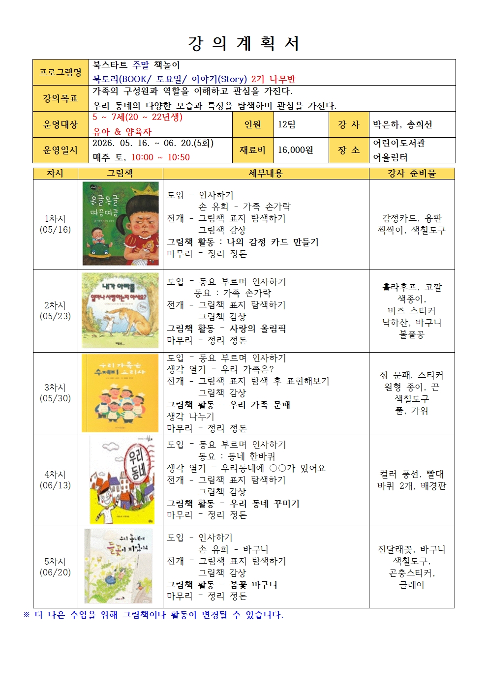 운영기간 : 2026. 5. 16. ~ 6. 20.(총 5회차) 매주 토요일, 오전 10시 ~ 10시 50분